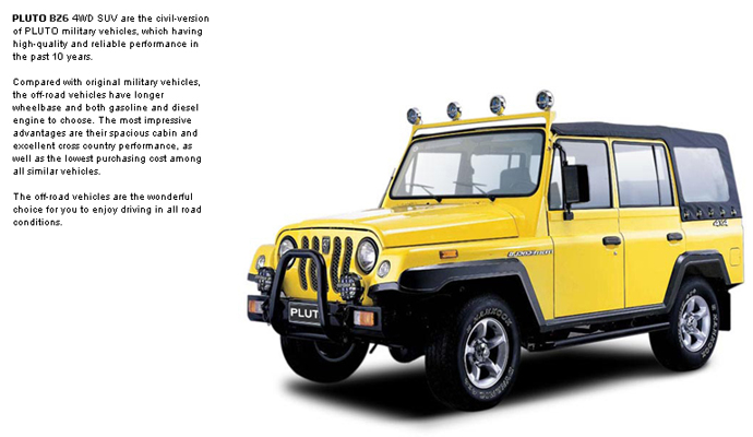 The 4WD SUVs are the civil-version of Pluto military vehicles, which have high quality and reliable performance in the past 10 years. This mid-size SUV can be configured with AM/ FM radio cassette player, power steering system, front disc brake and rear drum brake.