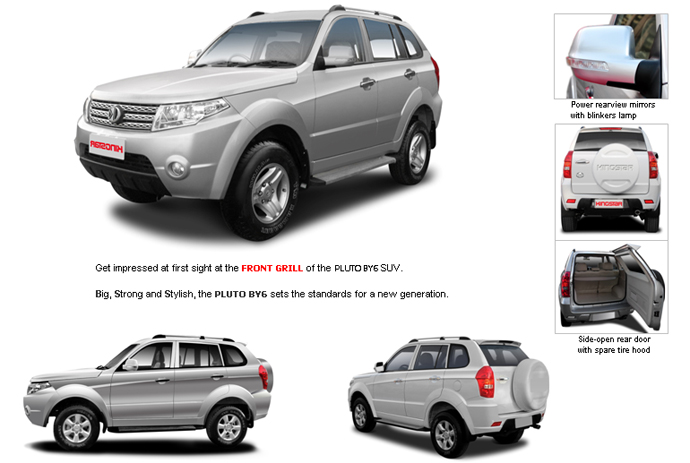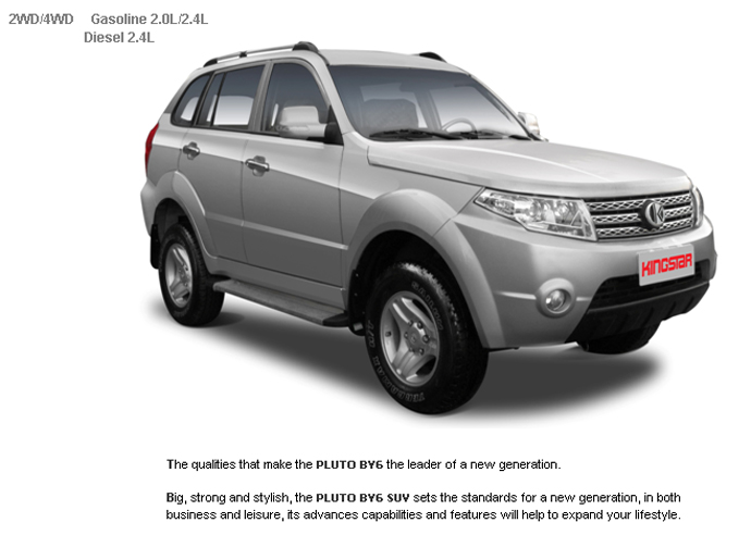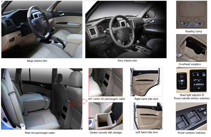 The 2WD SUV is fitted with CD/MP3 USB port, 6 speakers, manual A/C, variable intermittent windshield wiper and fabric-trimmed seats. Our luxury SUVs adopt DVD/SD card interface, 6 speakers, automatic A/C and leather-trimmed seats. In order to keep safety, both our 2WD SUV and 4WD SUV employ ABS and EBD system, air bags, 3-point seat belts, backup radar and remote keyless entry device.
