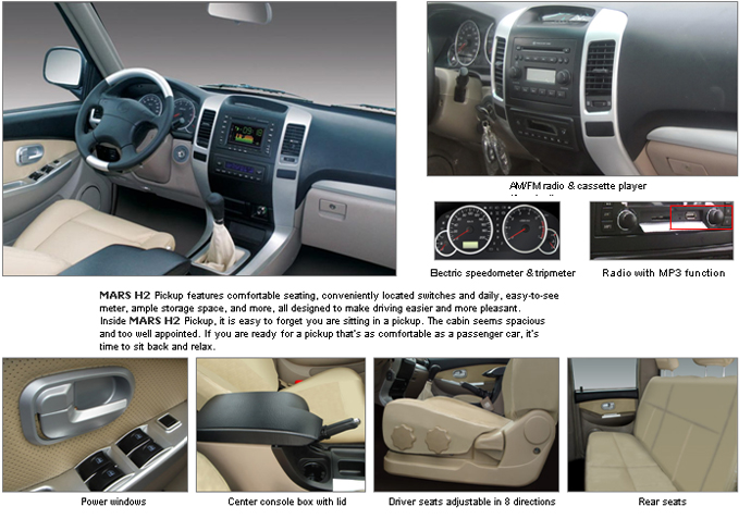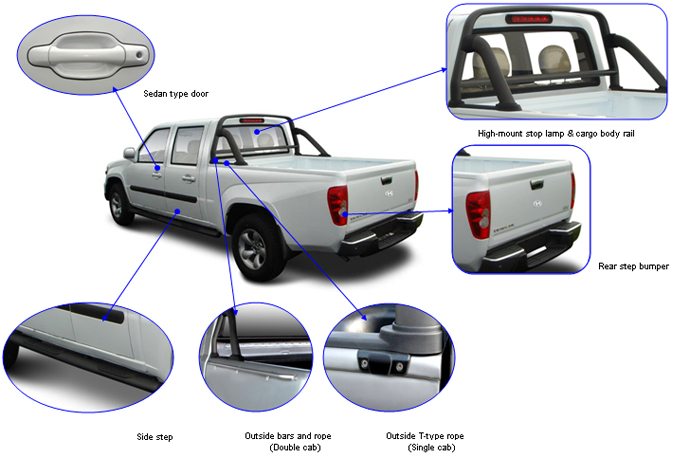 This double cab pickup truck can be equipped with aluminum wheels, power steering system, radio with MP3 function and leather-wrapped seats. Our luxury pickups with a superior passenger space can seat up to 5 persons. Adopting newest technologies and designing theories, this double cab pickup truck features fashionable exterior design, irresistible appeal, maturity in interior quality, providing you a comfortable driving experience. Our luxury pickups are produced with various colors, such as pearl white, elegant grey, champagne gold, dark grey, shining orange, diamond blue and imperial black.