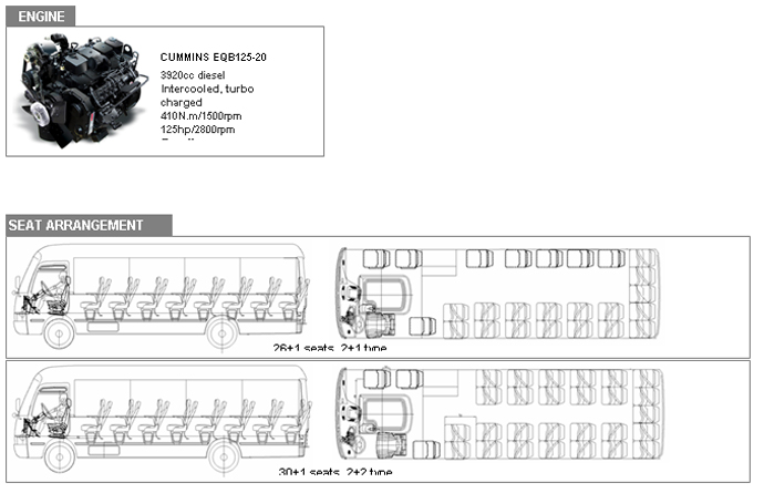 The maximum power of this light bus can obtain 92/2800 hp/rpm. Our tourist buses employ dual-circuit air brake, energy storage spring parking brake as well as integral power steering system.