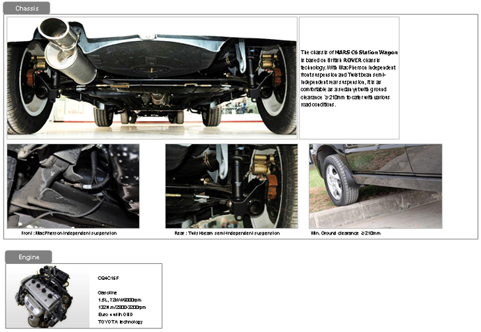 With MacPherson independent front suspension and twist-beam semi-independent rear suspension, this station wagon is as comfortable as a sedan. The ground clearance of the sport utility vehicle is mort than 210 mm in order to cater with various road conditions.